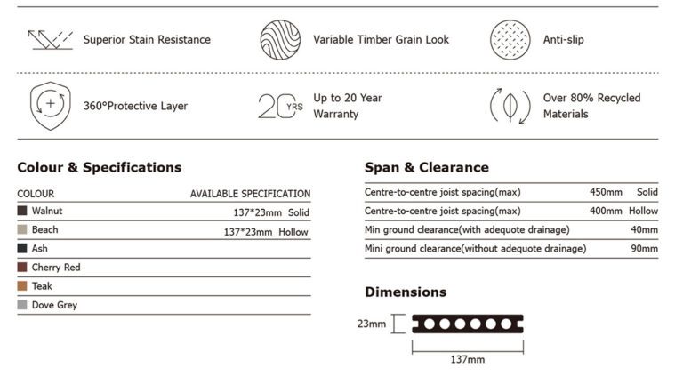 The 360° shield protects against water, UV rays, fungi, staining, and scratching, preventing issues like color fading, rotting, cracking, and mold. Co-extrusion decking is scratch-resistant, stain-resistant, long-lasting, and available in various colors and wood grain patterns, making it a durable and versatile choice for any outdoor space.